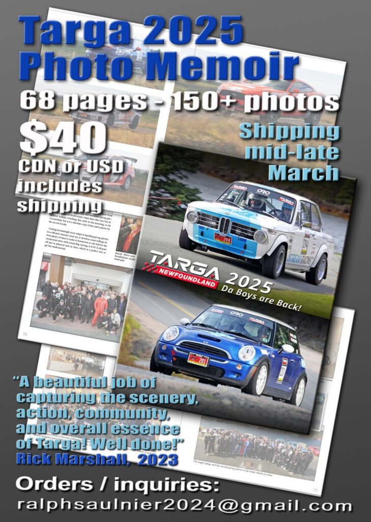 Once again, Ralph has produced a spectacular Targa photo memoir for the 2025 event. See the ad below to order yours. Check out more of Ralph’s photography work on his site ralphsaulnier.smugmug.com.